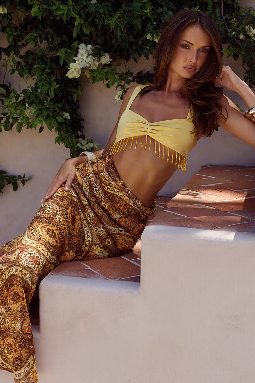 With a low waist cut out and under bust beaded trim, our Alzona Maxi Dress is unique and feminine.