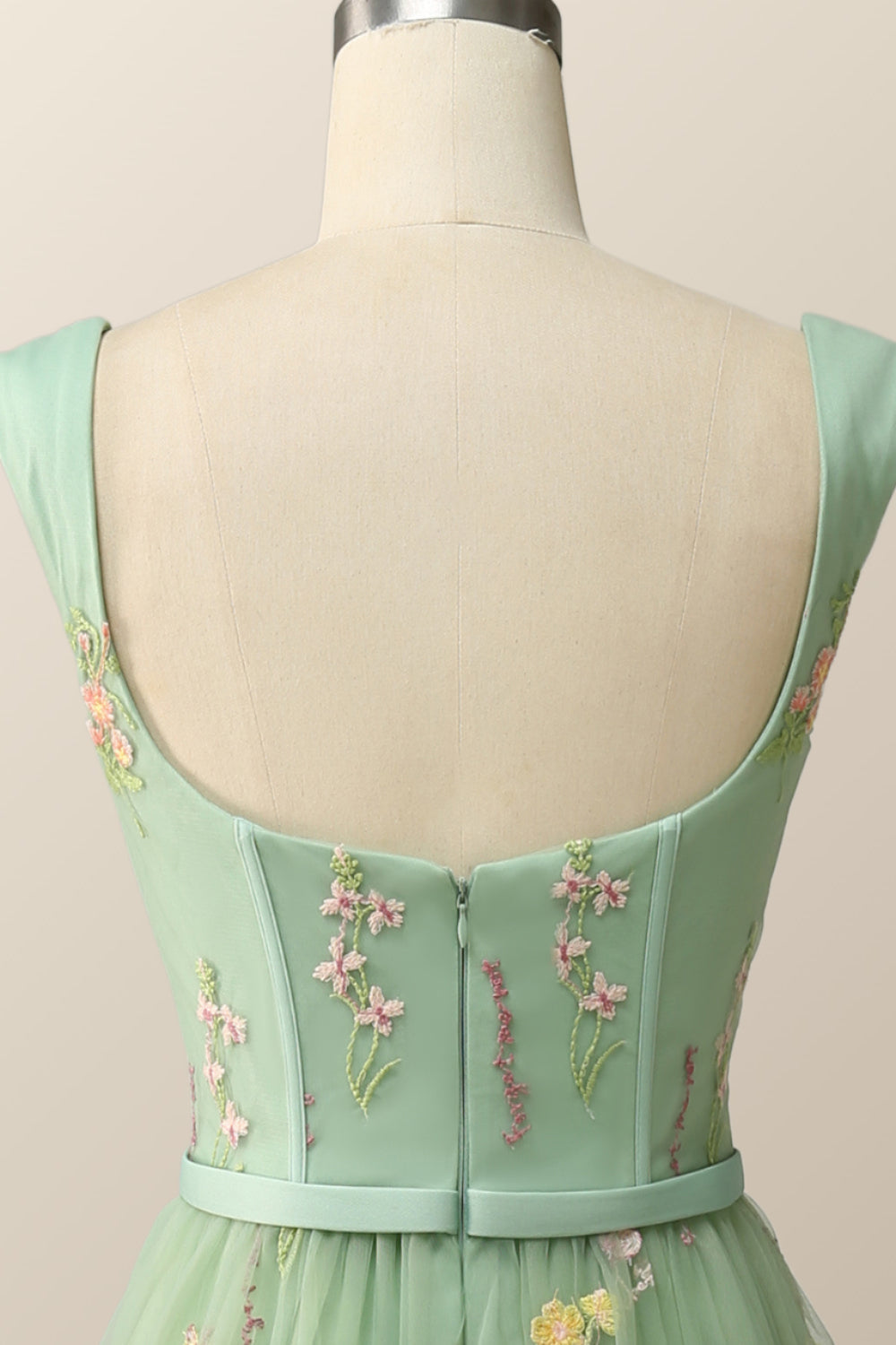 This luxurious green woman's dress is made of tulle and features delicate floral embroidery. It has a midi length, an A-line silhouette, cap sleeves, a square neck, and a zip-up back. Fully lined and with a built-in bra, it ensures a comfortable fit that is sure to make any special event an unforgettable experience.