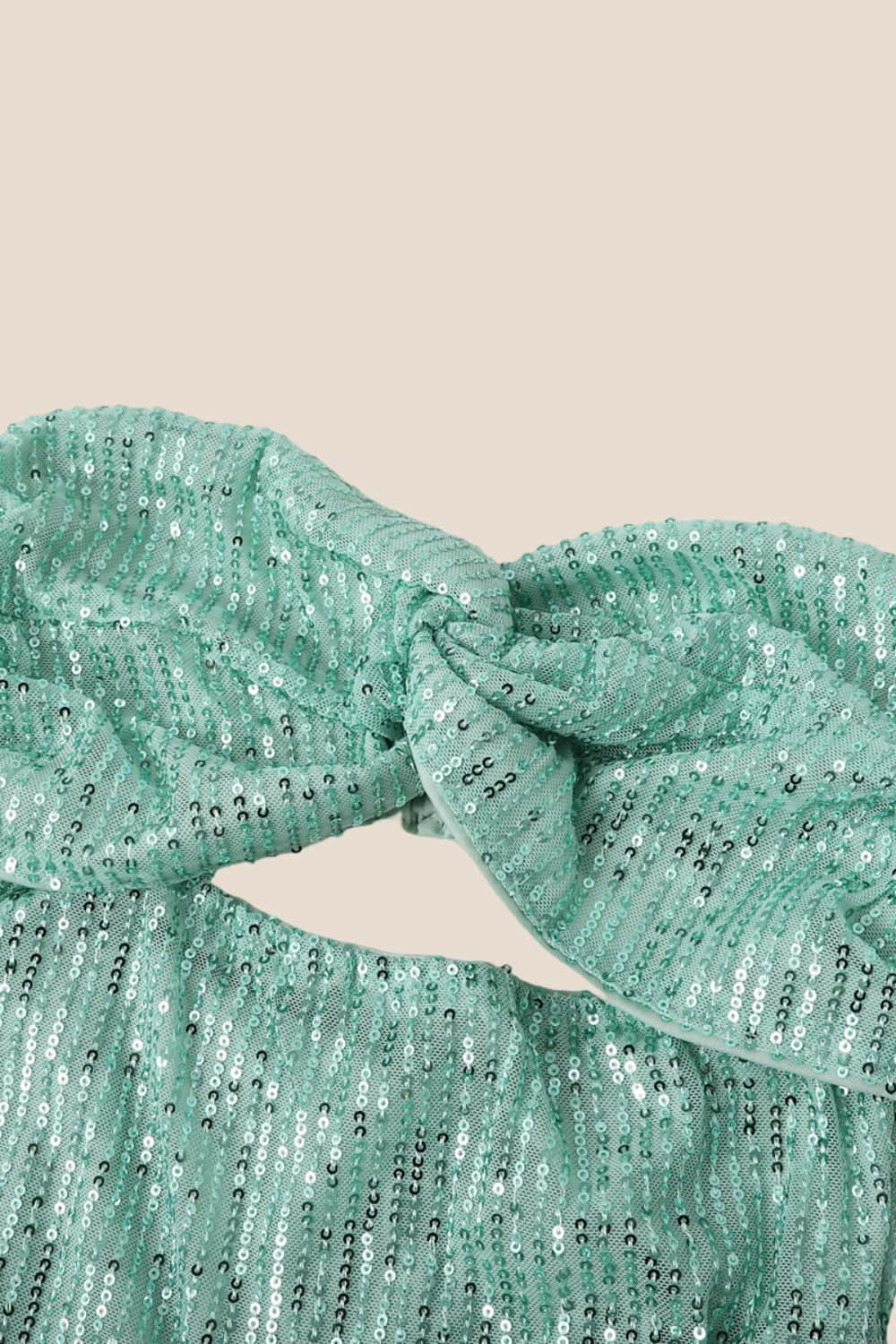 This green sequin dress offers a fitted silhouette with a strapless neckline and a stylish twist detail at the front. It features a cutout on the bodice and an elastic back for added comfort. The dress is designed to sit above the knee, combining elegance with a flattering fit.
