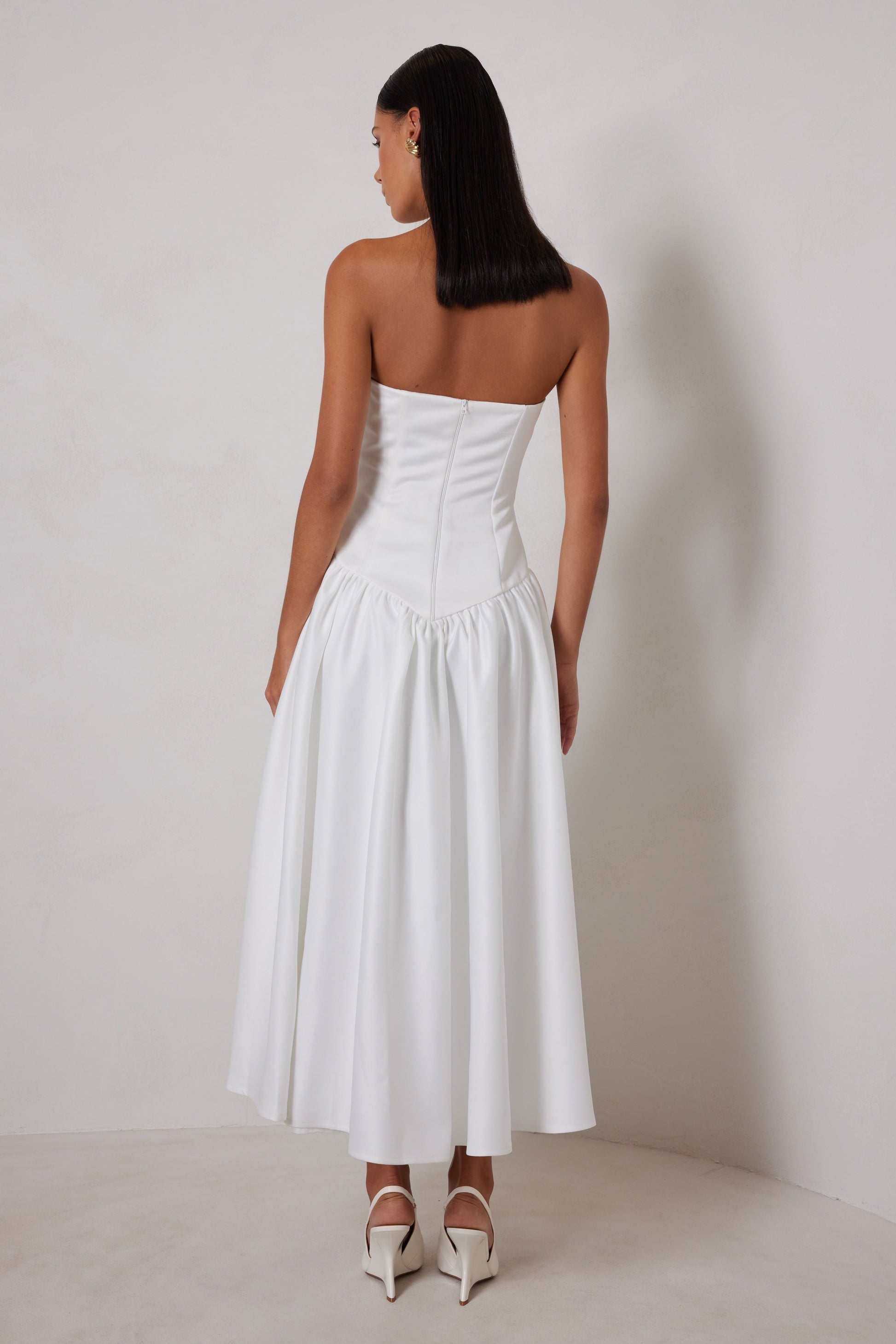 Make a statement in the elegant Maggie Dress, crafted for modern sophistication. The fitted bodice provides a sleek and flattering silhouette, transitioning into a voluminous, gathered skirt that adds playful movement. Also available in Midnight Blue.