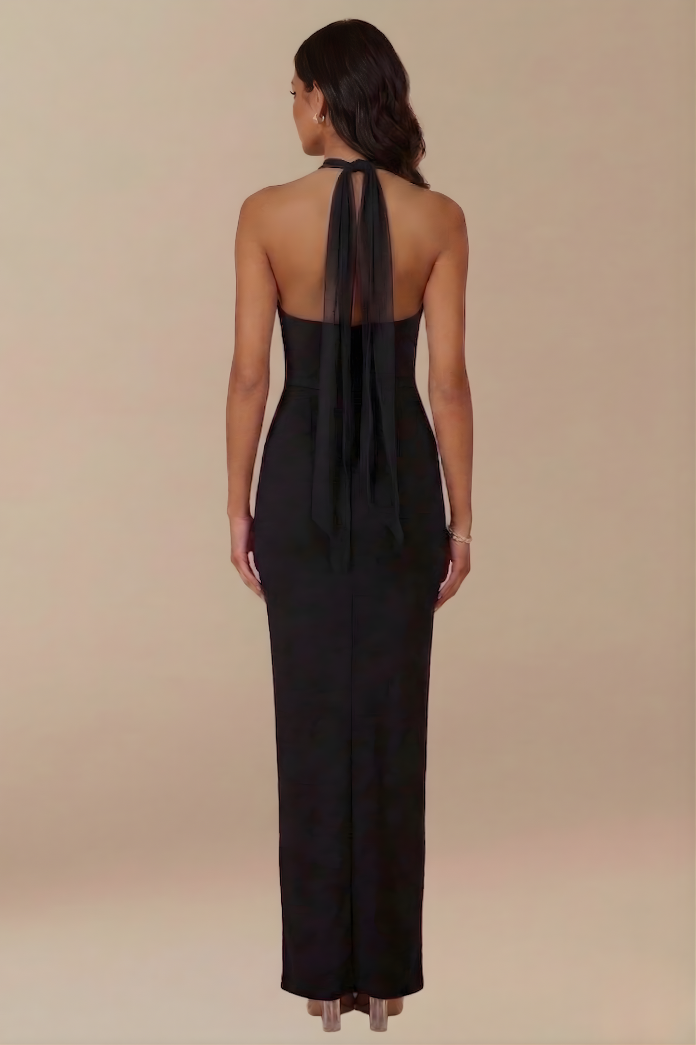 The Sable Gown embodies modern elegance and timeless sophistication. Crafted with a structured bodice draped in a delicate mesh overlay. Featuring a chic halter neckline with mesh tie behind the neck. It has a striking low back and mesh ties behind the neck. This statement gown is designed to turn heads at every occasion. Its sleek column silhouette and back-split hem add effortless movement and grace.